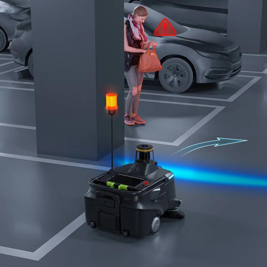 MT1 Max มาพร้อมไฟเตือนสูง 1.2 เมตร และไฟฉายสัญญาณความปลอดภัย พร้อมสัญญาณเสียงและแสง ทำให้มองเห็นหุ่นยนต์ได้ชัดเจนทั้งคนและรถ ช่วยป้องกันความเสี่ยงได้อย่างเชิงรุก